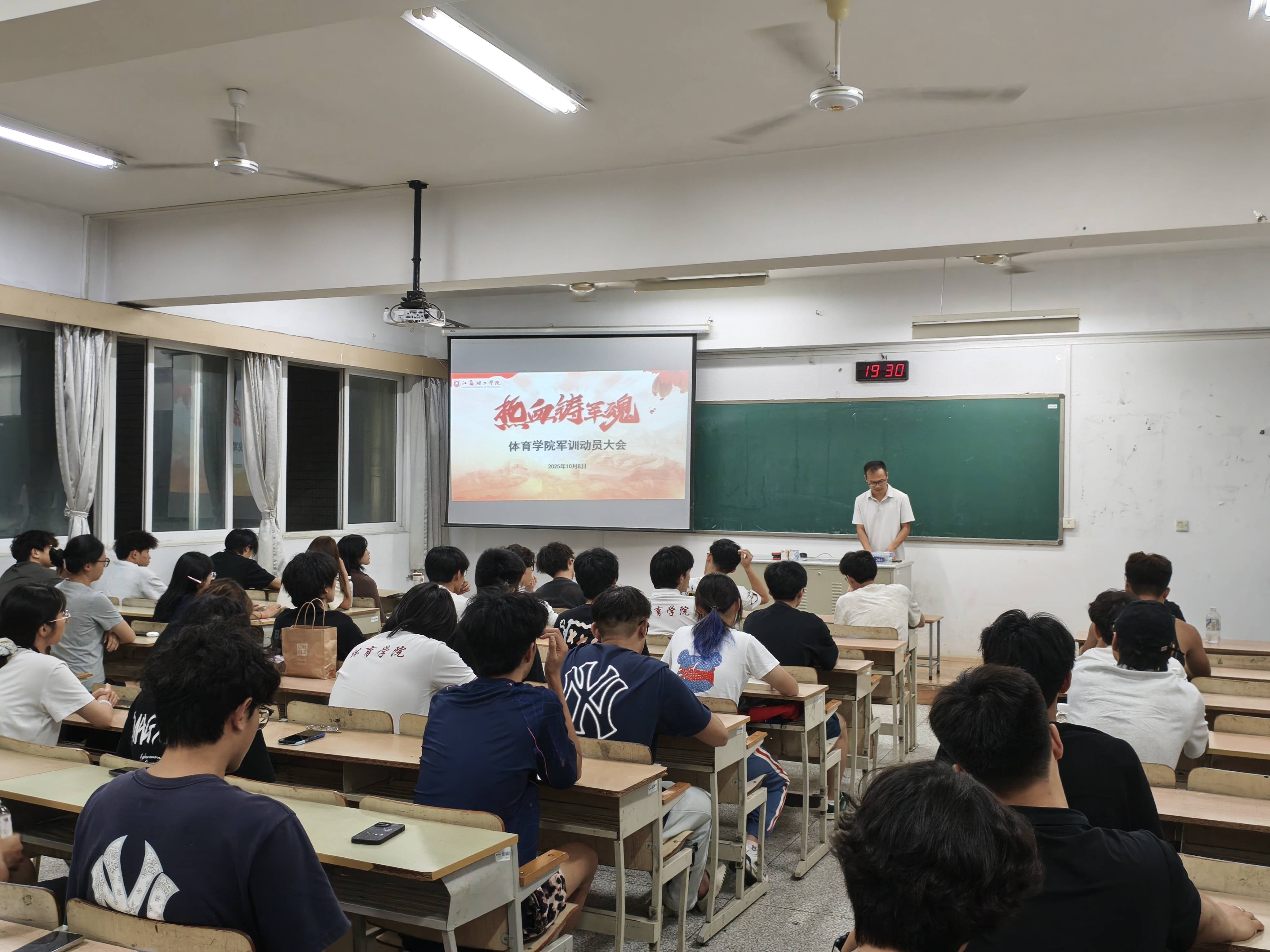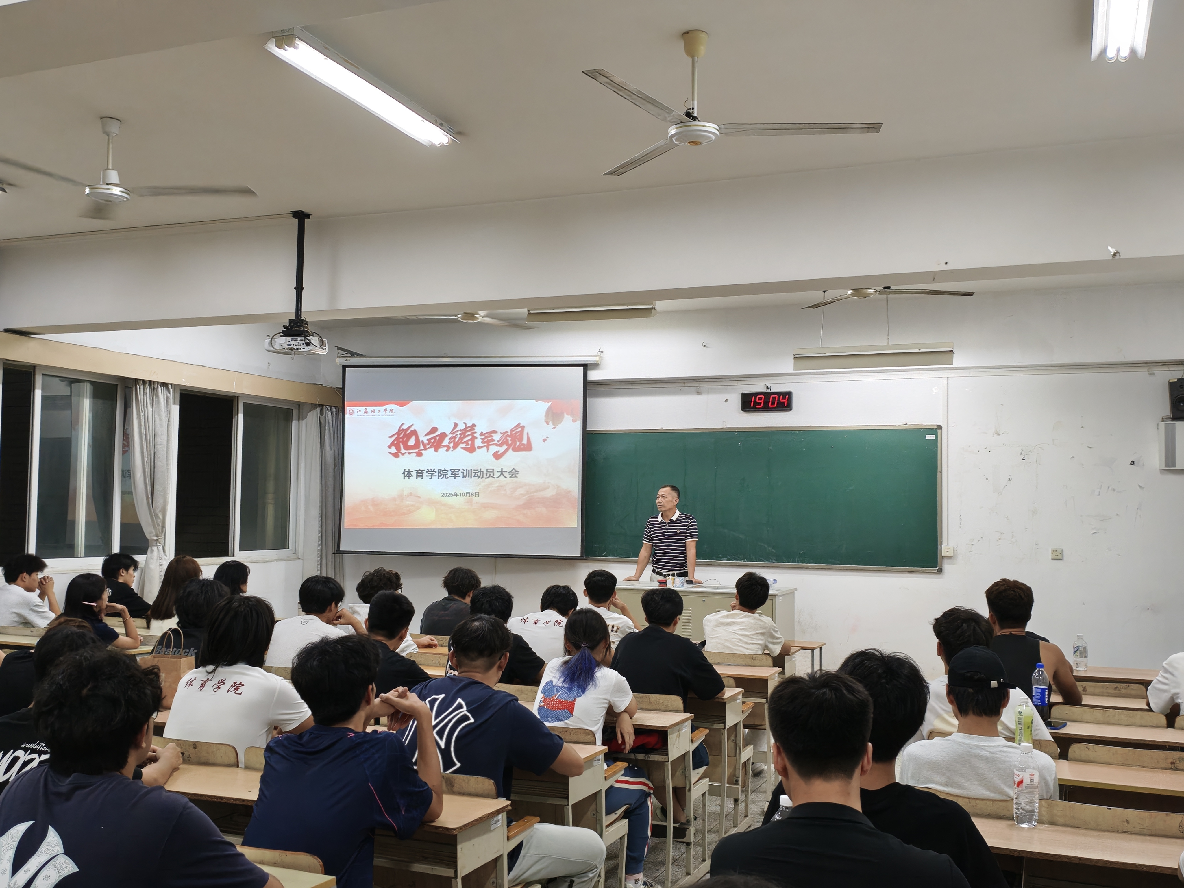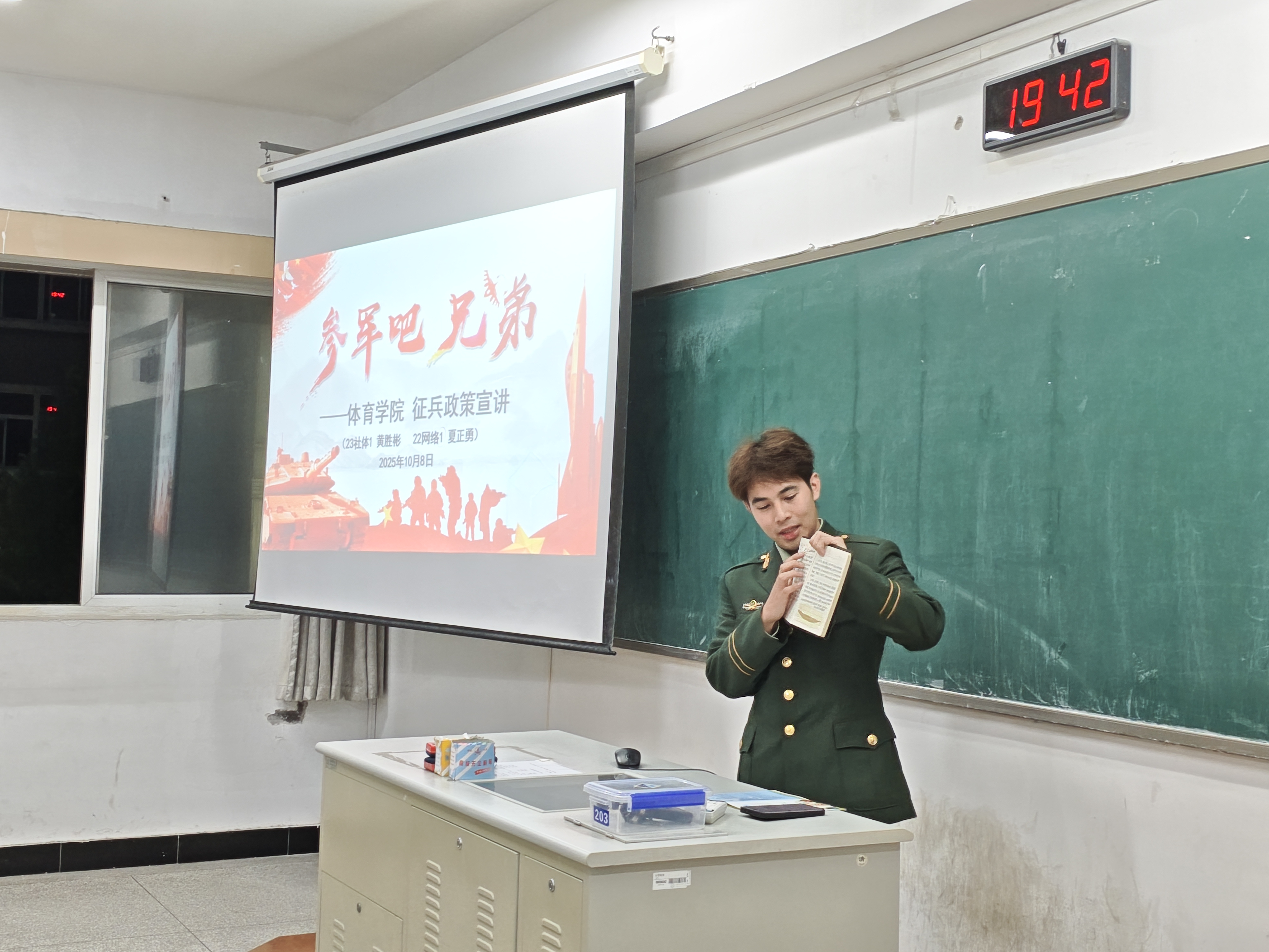 10月8日晚,体育学院2025级军训动员大会暨征兵政策宣讲会在65号楼203教室举行。全体新生、学院副书记副院长刘德华、辅导员曹庆泽、特邀退伍军人23社体1黄胜彬和22网络1夏正勇参加,大会由学工办主任郝大兵主持。