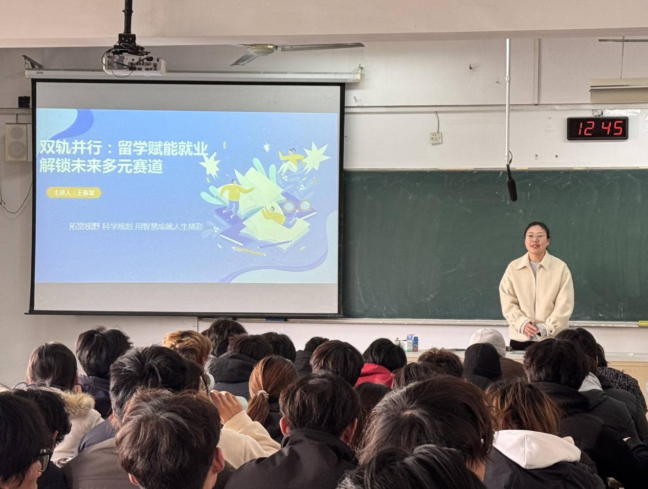 开拓体育专业学子国际视野,探索国际办学渠道,拓宽就业与升学通道,科学规划未来发展路径1127,体育学院特邀外国语学院培训中心特聘留学顾问王春慧老师,开展了以“双轨并行:留学赋能就业解锁未来多远赛道”为主题的国际交流会。本次分享会聚焦 “留学赋能就业” 双轨发展模式,为在场学子解锁多元未来赛道,赢得热烈反响。